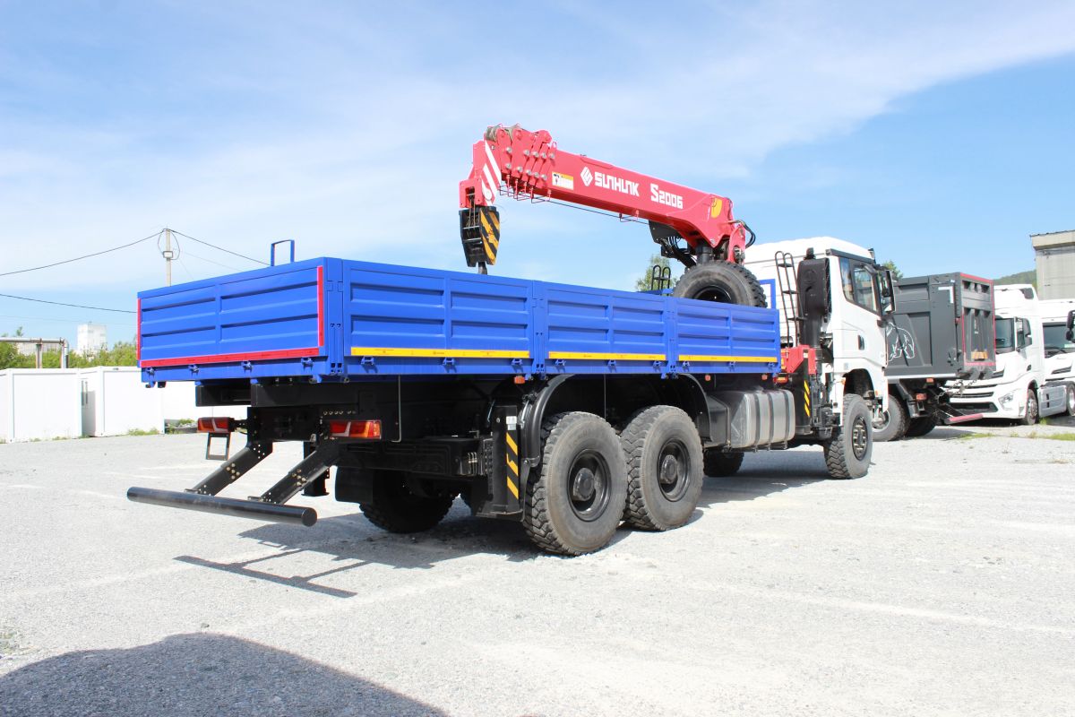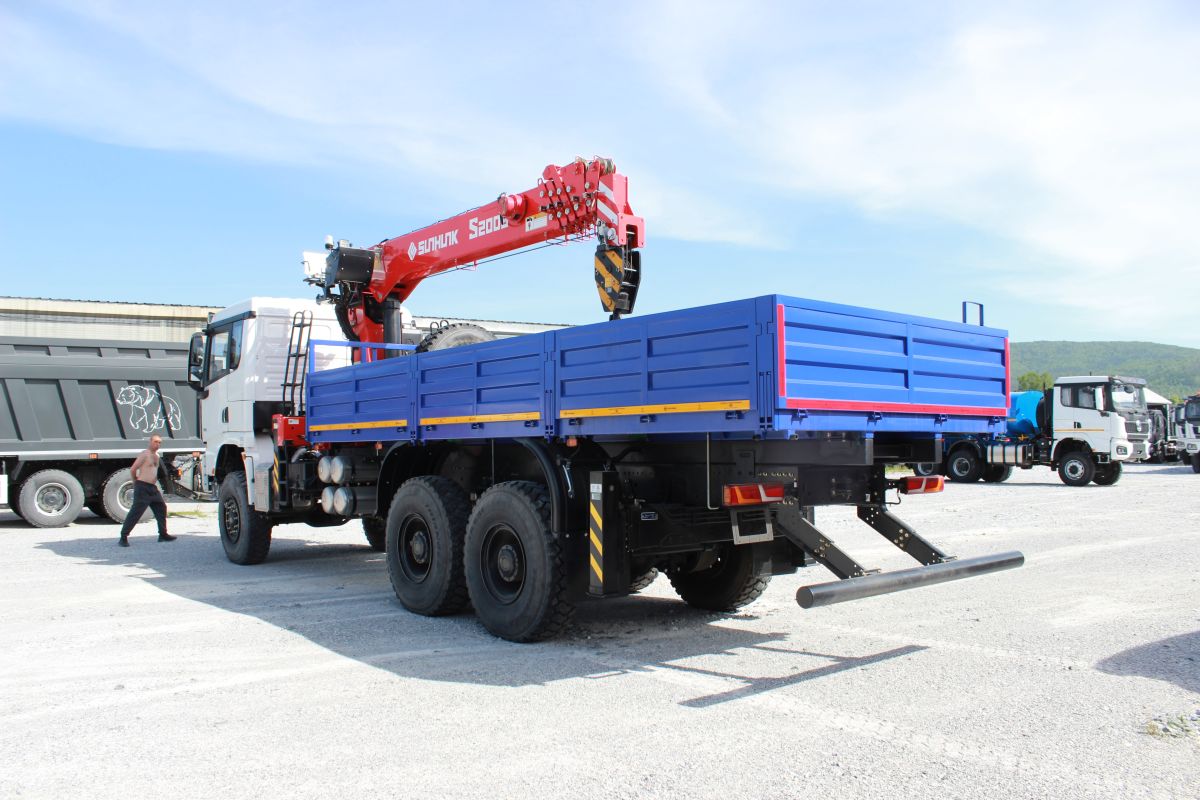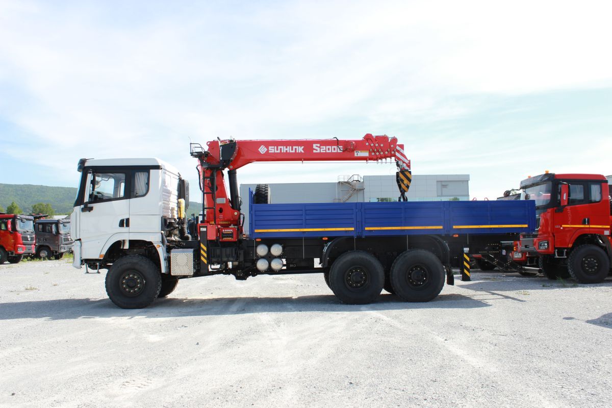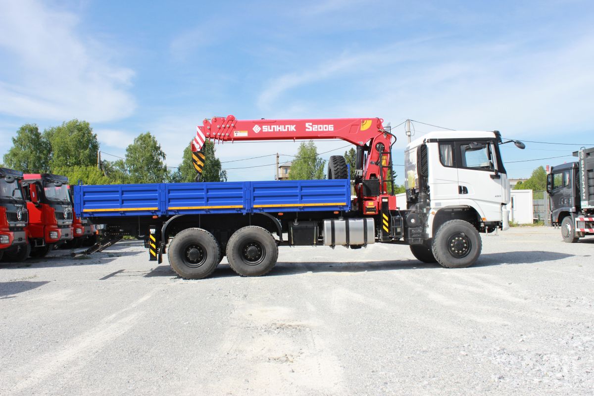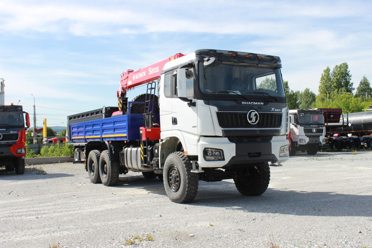 Автомобиль бортовой с КМУ SUNHUNK S 2006 на Шасси SX32586V385, 6×6, кабина X3000 Рестайлинг, WP12.430E50, КПП: 12JSDX220TA-B+КОМ, раздаточная коробка ZQC2000, шины ОДНОСКАТ 14R20.