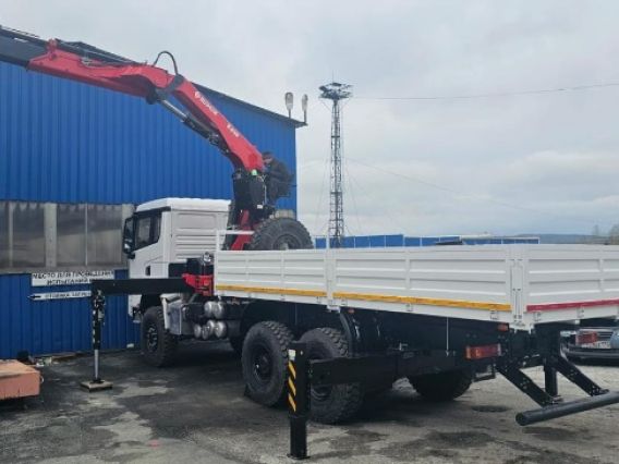 Бортовая платформа: 6400х2550х600 (д/ш/в) в мм., пол: ламинированная фанера, съемные борта, стойки быстросъемные, контейнерные фитинги. КМУ SUNHUNK K238-4 с доп. опорами.