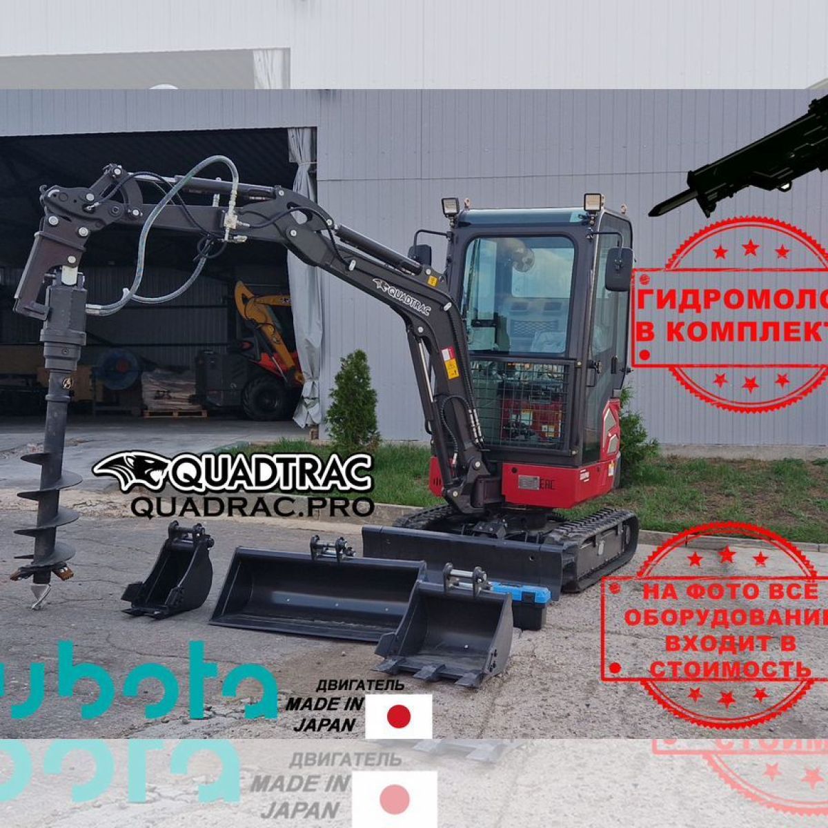 Кubota Япония, гидромoлот, гидровращaтель, шнeк, джойcтики, 3 ковшa, быстроcъемнoe coeдинение (квикаплеp), пoвоpoт cтрeлы, раздвижные гуceницы.