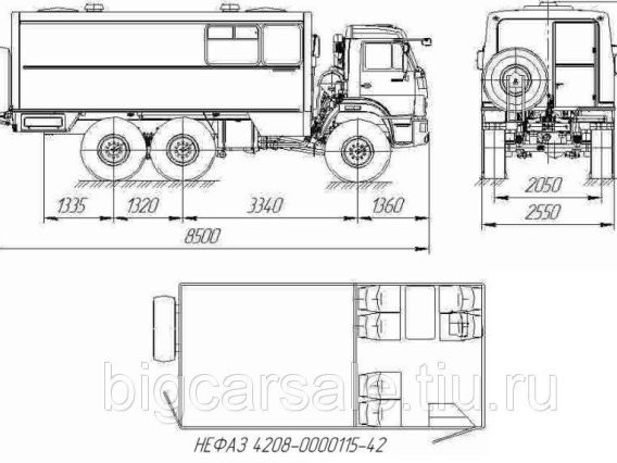 Модель надстройки: НЕФАЗ 4208-411-15; Тип надстройки: С грузовым отсеком; Количество мест: 6+2; Колесная формула: 6х6; Шасси: КАМАЗ 5350-3014-42; Двигатель: КАМАЗ 740.622-280 (E-4); Коробка передач: ZF9