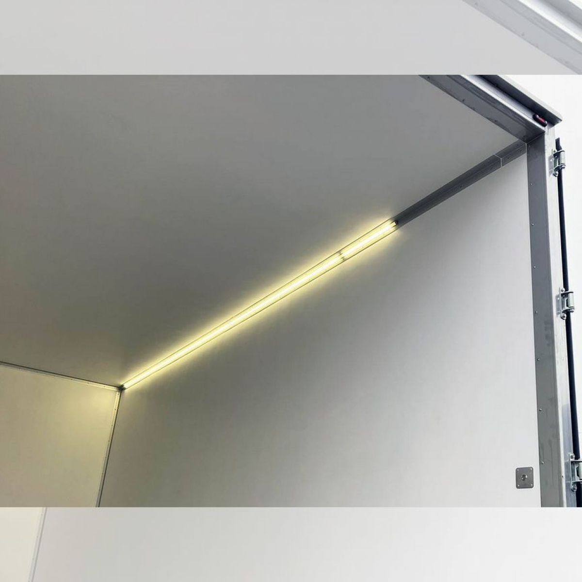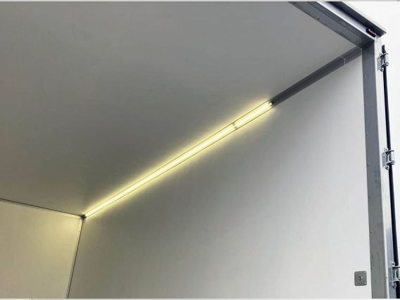 - Освещение: светодиодная лента, смонтированная на потолке с правой стороны в алюминиевом коробе с рассеивателем на 2/3 внутренней длины фургона. Передние белые габаритные огни, 2 шт. Задние красные габаритные огни, 2 шт. Боковые желтые габаритные огни по 3 шт. на каждую сторону. Включатель света в кабине