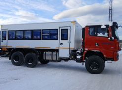 Технические характеристики фургона: - со скосами, - внешняя обшивка - плакированный металл белого цвета или зеленого цвета. - внутренняя обшивка - ламинированная фанера серого цвета - утепление 40 мм пенопласт - настил пола - автолин, - освещение 4 плафона 24 В - окна типа «ГАЗель»: сдвижное - 2 шт, глухое - 3 шт - двери: задняя - аварийная - боковая дверь с глухим окном - заниженный боковой вход - выдвижная лестница с алюминиевыми накладками под задней аварийной дверью - залицовка - плакированный металл белого цвета - фонари стандартные + боковые габаритные огни - ДЗК стандартное - установка фургона на шасси - подкрылки - посадочные места с ремнями безопасности – 20 шт. - аварийно вентиляционный люк - отопитель фургона планар-8д - переговорное устройство «фургон-кабина».